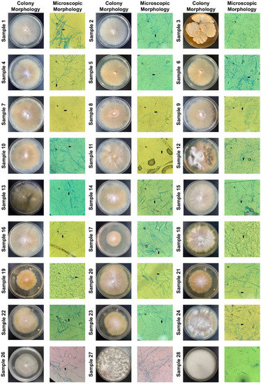 We used the RPA-Cas12a fluorescence assay to detect these clinical samples (directly using hair and scurf) so that we can determine the specificity and sensitivity. The results showed that 26 samples were identified as dermatophytes, 24 samples were identified as M. canis, and 2 samples were identified as T. mentagrophytes (Figure 5). Meanwhile, we inoculated all samples on SDA plates and incubated them at 30 °C for 2 weeks. After colony growth, we performed micromorphological studies and ITS sequencing for these clinic isolates (Figure 6 and Table 1). M. canis produces septate hyphae and spindle-shaped macroconidia, and the macroconidia can be identified in all M. canis positive samples (black arrows in Figure 6). While samples No. 27 and 28 were negative for Wood’s lamp examination, while our RPA-Cas12a fluorescence assay tests were positive for T. mentagrophytes which were consistent with microscopic morphology. The sequencing results were searched using NCBI Blast to identify microorganisms. The ITS sequencing results of the culture samples were considered standard results (Table 1). The sequencing results all agreed with the results of RPA-Cas12a fluorescence assay.