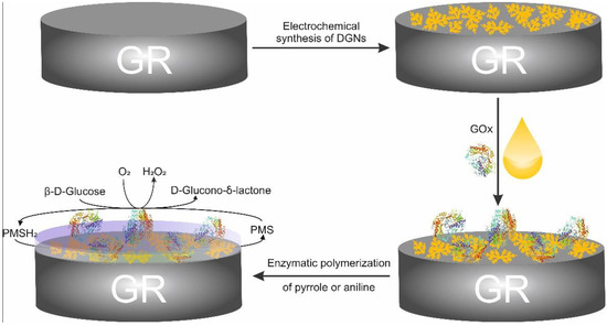 The principle of DGNs electrochemical formation, enzymatic polymerization on GR electrode, and electrochemical investigation are represented in Figure 1. PMS as a redox mediator reoxidizes the GOx-FADH2, and electrons from PMSH2 are transferred towards the positively charged GR electrode through DGNs.