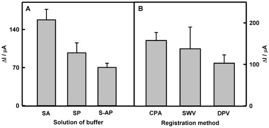 To select the most optimal buffer among several available, the CPA was used, and the biosensor response against different glucose concentrations in stirred (1200 rpm) 0.05 mol L−1 SA, SP, or S-AP buffers (pH 6.0) with 0.1 mol L−1 KCl and 6 mmol L−1 of PMS (oxidized form) at +0.3 V vs. Ag/AgCl(3 mol L−1 KCl) was evaluated.