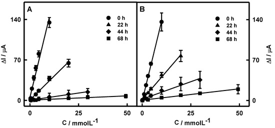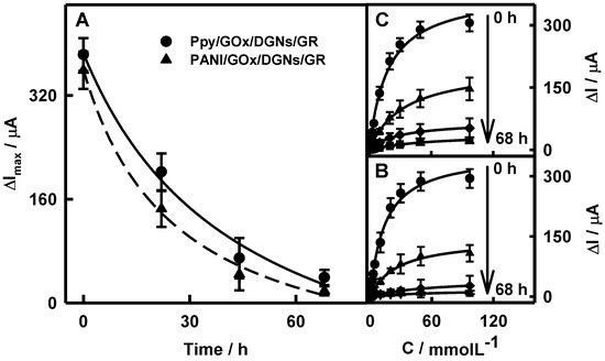 The influence of enzymatically formed PANI and Ppy layers on the current response and hyperbolic dependence of CPA signals towards glucose in the concentration range from 0.10 to 97.0 mmol L−1 were also determined for the PANI/GOx/DGNs/GR and Ppy/GOx/DGNs/GR electrodes (Figure 3). The formation of the Ppy or PANI layer on the surface of the GOx/DGNs/GR electrode was carried out for 22, 44, and 68 h. This process is very sensitive to many parameters: DGNs were individually formed on each electrode, the enzyme solution was also individually deposited on the DGNs/GR, and the coverage of the surface area and orientation of enzyme was random. The error bars were calculated from results obtained from a minimum of 3–5 different electrodes. It can be seen that Michaelis-Menten kinetics well describe the dependence of the analytical signal on glucose concentration. (Figure 3B,C). The maximal current (ΔImax) was used as parameter a of the hyperbolic function when the apparent Michaelis constant (KM(apparent)) was applied as parameter b.