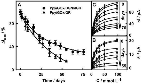 The current responses of the Ppy/GOx/GR and Ppy/GOx/DGNs/GR electrodes toward glucose gradually decreased during the first 16 days to 66.2 and 73.9%, respectively (Figure 5A). From 23 to 35 days, current responses decreased from 51.4 to 29.7 and from 57.9 to 46.3%, respectively. The τ1/2 for biosensors based on the Ppy/GOx/GR and Ppy/GOx/DGNs/GR electrodes were 22 and 33 days, respectively. The glucose biosensor fabricated using Ppy was 1.50 times more stable than electrode without Ppy (τ1/2 = 22 days) [44], and 1.50 and 1.94 times more stable than the GOx/PANI-AuNPs(6nm)-GOx/GR (τ1/2 = 22 days) or GOx/Ppy-AuNPs(6nm)-GOx/GR (τ1/2 = 17 days) electrodes [48]. Moreover, use of Ppy made it possible to achieve 3.37 and 4.71 times higher stability in comparison with biosensors based on the Ppy/GOx/AuNPs(el depos.)/GR electrode (τ1/2 = 9.8 days) [23] and based on the GOx/PANI/Au nanorods/Pt electrode (τ1/2 = 7.0 days) [25], respectively. The registered current response decay might be based on the decreased activity of the enzyme during the storage and repeated measurements of the Ppy/GOx/DGNs/GR electrode, as was reported in previous researches [46,50].