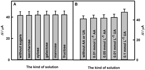 The influence of 1.0 mmol L−1 sugars (A) and electroactive species (B) on the current responses of the glucose biosensor based on the Ppy/GOx/DGNs/GR electrode in the presence of 10.0 mmol L−1 glucose. Enzymatic polymerization was performed for 22 h; current responses were registered in the presence of 6 mmol L−1 PMS at +0.3 V vs. Ag/AgCl/KCl(3 mol L−1).