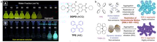 (a) Photographs of ACQ and AIE molecules in the mixture of water/THF with different water fractions under 365 nm of UV light irradiation (reproduced with the permission from Ref. []. Copyright 2018, American Chemical Society); (b) schematic illustration of RIM mechanism, including restriction of intramolecular rotation and restriction of intramolecular vibration. (Reproduced with the permission from Ref. []. Copyright 2014, WILEY-VCH Verlag GmbH & Co. KGaA, Weinheim).