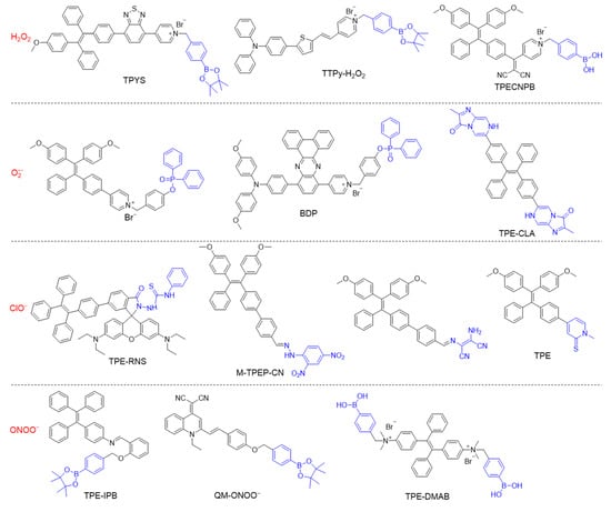 When designing a specific chemical/biological probe, a usually requisite is to synthesize molecules with specific recognition groups or moieties. The typical chemical structures of some reactive oxygen nitrogen species (RONS)-responsive AIEgens are listed in Figure 2. The boronate subunit is a popularly used building block for H2O2 sensors, as the boronate cage is nonfluorescent and the conversion of arylboronates to phenols results in turn-on emission [,,]. The deprotonated H2O2 is a potent nucleophile, which can attack the boron center to generate a labile borate species that hydrolyses to the corresponding phenol []. For O2•− detection, the diphenyl phosphinyl group can be introduced into an organic compound, in which the fluorescence is strongly quenched at first, and obvious turn-on fluorescent signal is realized in the presence of O2•− [,]. The oxidative properties of ClO− can be utilized to destroy C=C or C=N bonds rapidly, therefor, the conjugation of fluorescence quencher through C=C or C=N bonds has turned out to be an efficient strategy to construct ClO− probes [,]. Some arylboronate groups, diphenylphosphinate groups, and nitrophenyloxoacetamide moieties have been employed as the response substitutes for ONOO− detection [,,]. The tunability of molecular structure will alter the photophysical properties and biomedical applications as well.