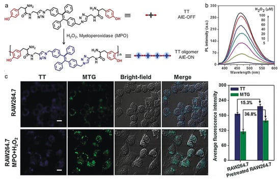 (a) Peroxidase-catalyzed polymerization in the presence of H2O2; (b) PL spectra of TT with the treatment of different concentrations of H2O2; (c) CLSM images and corresponding fluorescence intensity of RAW264.7 cells pretreated without and with MPO and H2O2 incubating with TT. Scale bars: 20 µm. (Reproduced with the permission from Ref. []. Copyright 2018, Wiley-VCH Verlag GmbH & Co. KgaA, Weinheim).