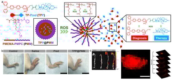 Wang and Li et al. reported a ROS-responsive theranostic nanoplatform for accurate diagnosis and therapy of inflammation diseases []. As depicted in Figure 4, a two-photon AIEgen (TP) was conjugated with the widely used anti-inflammatory glucocorticoid, prednisolone (Pred) with the ROS-sensitive linkage to afford the compound TPP. Then, the TPP was encapsulated with an amphiphilic block copolymer PMPC−PMEMA (PMM) to give polymeric micelles (TPP@PMM). Noteworthy, the PMEMA part served as the hydrophobic block in the NPs formation, which could be oxidized in response to ROS to yield the hydrophilic sulphone product. The ROS-triggered hydrophobic-to-hydrophilic conversion was able to realize ROS-mediated drug delivery at an inflammatory site. This shell-core dual ROS-responsive nanoplatform was used in three different inflammatory murine models including acute lung injury, atherosclerosis, and arthritis. The deep-penetration two-photon fluorescence diagnosis and efficient serial ROS sensitive anti-inflammation could be used for both acute and chronic inflammation theranostics. Two-photon imaging with the AIEgen helped to provide unambiguous delineation of inflammatory tissue with minimum autofluorescence interference. Moreover, TPP@PMM also possessed excellent anti-inflammatory effect that reduced the inflammatory response and decreased inflammatory cytokines expression.