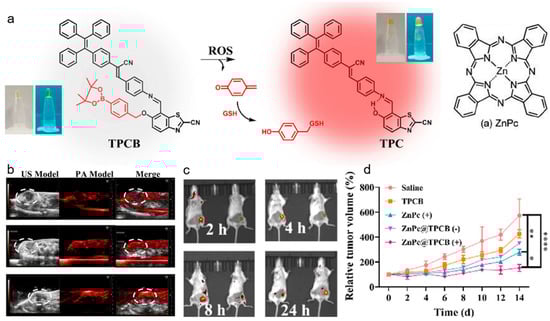 (a) Chemical structure and the ROS-activatable process of TPCB probe; (b) in vivo ultrasound and PA and (c) fluorescence imaging of 4T1 tumor-bearing mice after injecting the nanoprobe; (d) tumor growth curves of 4T1 tumor-bearing mice with different treatments. * p < 0.05, ** p < 0.01, **** p < 0.001. (Reproduced with the permission from Ref. []. Copyright 2021, American Chemical Society).