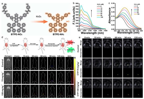 - Chen, J.; Chen, L.; Wu, Y.; Fang, Y.; Zeng, F.; Wu, S.; Zhao, Y. A H2O2-activatable nanoprobe for diagnosing interstitial cystitis and liver ischemia-reperfusion injury via multispectral optoacoustic tomography and NIR-II fluorescent imaging. Nat. Commun. 2021, 12, 6870. [Google Scholar] [CrossRef]