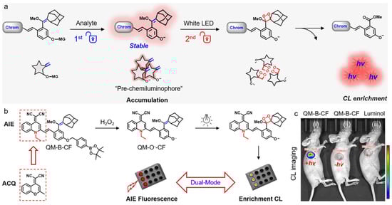 (a) Schematic of the dual-lock probe triggered sequentially by analyte and light for CL imaging; (b) the reaction processes of AIE-based dual-lock probe QM-B-CF; (c) in vivo imaging of 4T1 xenograft tumor-bearing mice after intratumor injection of QM-B-CF or luminol. (Reproduced with the permission from Ref. []. Copyright 2020, Wiley-VCH Verlag GmbH & Co. KGaA, Weinheim).