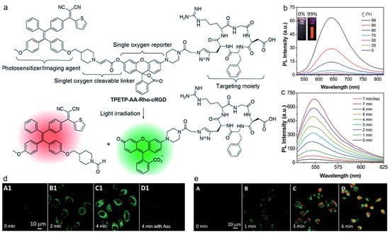 (a) Schematic illustration of TPETP-AA-RhocRGD for self-reporting 1O2 detection; (b) photoluminescence of TPETP in DMSO/water mixture with different water fractions; (c) photoluminescence spectra of the probe under light irradiation at different time points; (d,e) CLSM images of MDA-MB-231 cells incubated with the probe under light irradiation at different time points as indicated. (Reproduced with the permission from Ref. []. Copyright 2016, The Royal Society of Chemistry).