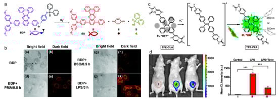 (a) Chemical structure of BDP and the O2•−-activatable process; (b) CLSM imaging of HepG2 cells with different treatments (reproduced with the permission from Ref. []. Copyright 2018, The Royal Society of Chemistry); (c) chemical structure and the O2•−-response mechanism; (d) in vivo CL images and corresponding imaging intensity of LPS-induced inflammation in mice. *** p < 0.001. (Reproduced with the permission from Ref. []. Copyright 2017, American Chemical Society).
