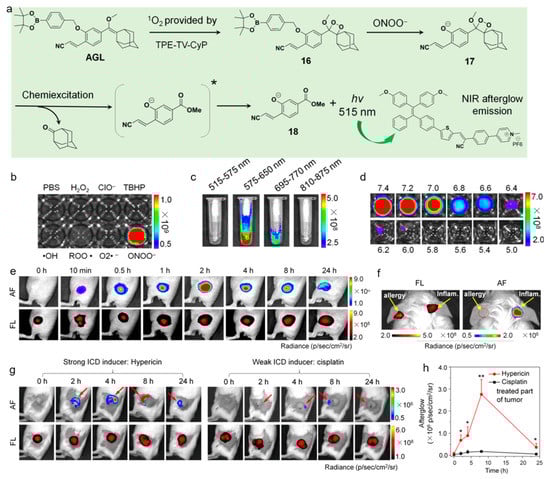 (a) Chemical structures and working mechanism of the ONOO− and pH dual-response afterglow luminescence; (b) selectivity of the nanoprobe with various ROS treatments; afterglow intensity of the nanoprobe (c) in different spectral regions and (d) different pH environments; (e) fluorescence and afterglow images of the acute inflammation after injecting the preirradiated nanoprobe at different time points; (f) fluorescence and afterglow images of the mouse with allergic left ear and inflammatory right ear; (g) fluorescence and afterglow images of the 4T1 tumor-bearing mice at different time points after receiving PDT with hypericin or cisplatin treatment and (h) corresponding afterglow intensity. * p < 0.05, ** p < 0.01. (Reproduced with the permission from Ref. []. Copyright 2022, American Chemical Society).