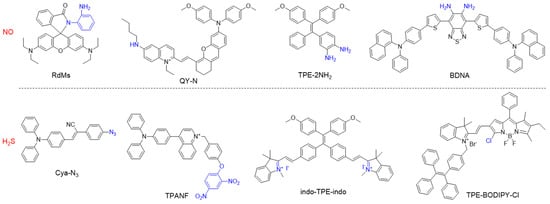 Small gaseous molecules including NO, CO, and H2S, function as important signal transmitters in living systems as they are associated with many biological functions and major diseases [,,,]. NO is a neutral diatomic free radical that is produced from L-arginine by NO synthase (NOSs) isoforms such as neuronal NOS (nNOS), inducible NOS (iNOS), and endothelial NOS (eNOS) [,]. CO is the second gasotransmitter that is generated as a byproduct of haem cleavage by two distinct haem oxygenases []. H2S is predominantly formed from Cys or its derivatives by the enzymes cystathionine β-synthase and cystathionine γ-lyase []. All these gasotransmitters play vital roles in vasorelaxation and inflammatory responses, thus, numerous molecular probes have been developed for precise monitoring of related diseases [,,]. For example, the o-diamino aromatic moiety is a recognition group for NO, and the cyclization reaction of o-diamine with NO produces a triazole moiety, which alters the electronic property and conjugation nature [,,]. For H2S detection, the popularly used approaches include reduction of azides into amines and nucleophilic addition of H2S to the electrophilic group [,]. Some representative AIEgens for sensing gasotransmitters are listed Figure 13, which show great potential for applications in biological imaging and disease diagnosis.