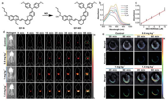(a) The response of QY-N towards NO; (b) absorption spectra and (c) intensity at 780 nm of QY-N with the treatment of different concentrations of DEA·NONOate; (d) NIR-II fluorescence and (e) PA imaging of liver injury mice intravenously injected with the nanoprobe QY-N at different time points. (Reproduced with the permission from Ref. []. Copyright 2021, Wiley-VCH GmbH).