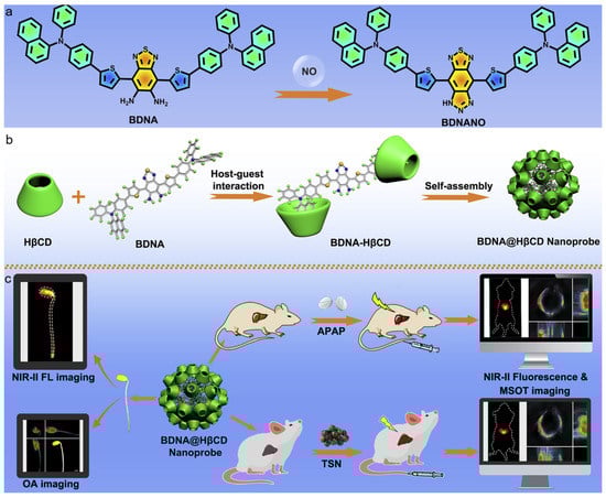 (a) The mechanism of BDNA for NO detection; (b) the formation of host–guest supramolecular complex BNDA–HβCD and the nanoprobe; (c) the BNDA@HβCD nanoprobe for in vivo NIR-II fluorescence and PA imaging of liver injury and detecting NO in soybean sprouts. (Reproduced with the permission from Ref. []. Copyright 2021, The Authors).