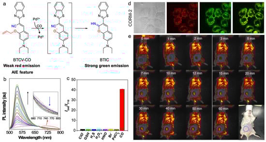 (a) The mechanism of AIE-based probe for CO detection; (b) PL spectra of BTCV-CO probe incubated with different concentrations of CORM-2; (c) PL intensity ratios (I546/I710) of BTCV-CO with the treatment of various biomolecules; (d) CL images of MCF-7 cells incubated with the probe; (e) in vivo fluorescence imaging of CO with the probe. (Reproduced with the permission from Ref. []. Copyright 2019, American Chemical Society).