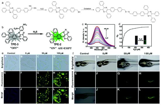 Tang and coworkers reported an AIEgen probe for detecting H2S []. As described in Figure 17a, the D-A compound was synthesized using tetraphenylpyrazine (TPP) as D, and malonitrile group as A. In the presence of H2S, the malonitrile was oxidized to a thiol intermediate, which underwent self-coupling to produce a dimer. During this process, the D–A interaction was destroyed, which resulted in a blue shift in the emission wavelength. The probe could be used for specific and sensitive H2S detection. Wu and Zeng et al. developed a fluorescent probe with both AIE and excited-state intramolecular proton transfer (ESIPT) characteristics for H2S detection (Figure 17b–f) []. Due to the strong electron-withdrawing property of the nitrobenzene group, the fluorescence of the probe was remarkably quenched. While in the presence of H2S, the nitrophenyl moiety was cleaved, and ESIPT feature occurred, thereby, the fluorescence intensified. The probe was formulated into water-dispersible NPs, which showed fast response and excellent selectivity toward H2S over many other reactive species. In vitro experiments in HeLa cells revealed that the nanoprobe was capable of detecting the exogenous and endogenous H2S. For zebrafish pretreated with the nanoprobe, there was no fluorescence in the untreated fish, while strong green fluorescence was observed in the fish incubated with NaHS-containing (NaHS was used as the H2S donor) media. Except for the detection of various ROS, RNS, RSS, and RCS, AIEgens have also been utilized for monitoring other disease-associated biomarkers such as pH, alkaline phosphatase (ALP), glutathione (GSH), β-galactosidase, hypoxia, etc. [,,,,]. Due to limited space, we do not discuss these in this review.