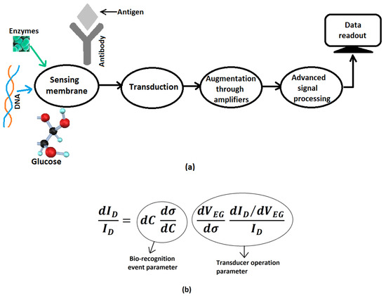 Here, the change in the conductivity alters the threshold voltage and thus the effective gate voltage VEG, which results in the variation of drain current ID. Alteration of this drain current, which is a measurable parameter, indicates the detection of the biomolecule and the extent of this alteration is related to the sensitivity. Figure 1 shows the schematic representation of the working principle of the biosensor and the formulation of the altered drain current dID due to biorecognition event to the initial drain current ID in the absence of biosignals, which is expressed as the product of the biorecognition and transduction parameters given in Equations (1) and (2). Various types of bioFETs are fabricated and proposed that rely more on BE or on the TR parameter or on both.