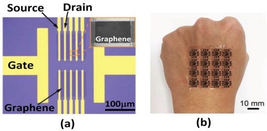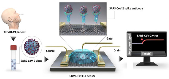 In some FETs, the analytes are introduced directly on the channel surface and the biomolecules are adsorbed on the surface either by chemisorption or physisorption processes as shown in Figure 2 in a graphene-based biosensor [36].