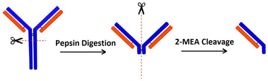 Schematic sketch illustrating the fragmentation of antibody molecule. Enzyme pepsin is used to cut the lower portion of the antibody. 2-mercaptoethylamine (2-MEA) is used as a reducing agent for further fragmentation. Reprinted with permission from [60], Copyright © 2012, American Chemical Society.