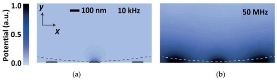 Spatial distribution of AC potential in 10 mM salt solution at (a) low modulation frequency of 10 kHz and (b) high modulation frequency of 50 MHz. Adapted with permission from [73], Copyright 2015 Springer Nature.