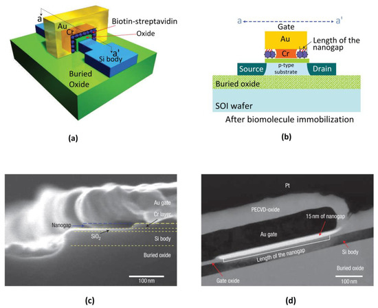 The same kind of concept can be applied for a dielectric modulated field effect transistor (DMFET) biosensor. Here, a vertical nanogap is fabricated near to the edge of the gate dielectric using thin film deposition and wet etching as carried out by Im et al. [40] and shown in Figure 11. Depending on the dielectric constant of the biomolecule, the total capacitance of the DMFET can be significantly altered, leading to a shift in the threshold voltage. The DMFET biosensor thus fabricated by Im et al. is highly sensitive to the specific binding of streptavidin to biotin, which caused a large shift in the threshold voltage. Gu et al. also fabricated a label-free biosensor with nanogap embedded FET. They found a remarkable change in the transistor parameters as the gate dielectric constant is changed by filling the nanogap with biomolecules and detected specific binding between the avian influenza antibody with antigen of silica binding protein [81]. Kim et al. also fabricated DMFET for label free detection of DNA [82]. They found a shift in the threshold voltage to the negative side for neutralized DNA and to the positive side for negatively charged DNA. They further fabricated a nanogap embedded CMOS (NeCMOS) and found that the threshold voltage shift is four times greater in a p-channel device than in an n-channel one, and a decrease in the nanogap length enhances the sensitivity [83].