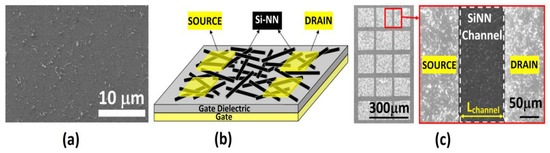 (a) SEM image of SiNN (b) Si-NN FET structure and (c) SEM image of fabricated SiNN FET. Reproduced from [90] under the Creative Commons Attribution License.