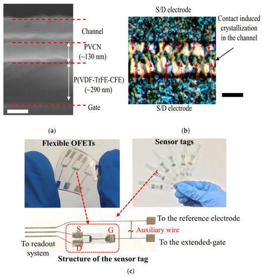(a) Cross-sectional SEM image exhibiting the material stacking of OFET; (b) polarized optical micrograph of the OFET depicting the contact-induced crystallization in the channel with perfluorobenzenethiol-modified silver source and drain electrodes; (c) fabricated OFETs and the sensor tag images depicting the extended-gate sensing and reference electrode. Reproduced from [101] under the Creative Commons Attribution 4.0 International License.