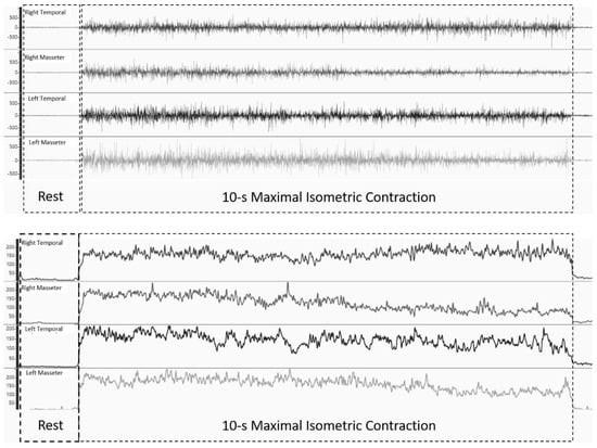 - dos Santos Berni, K.C.; Dibai-Filho, A.V.; Pires, P.F.; Rodrigues-Bigaton, D. Accuracy of the surface electromyography RMS processing for the diagnosis of myogenous temporomandibular disorder. J. Electromyogr. Kinesiol. 2015, 25, 596–602. [Google Scholar] [CrossRef]