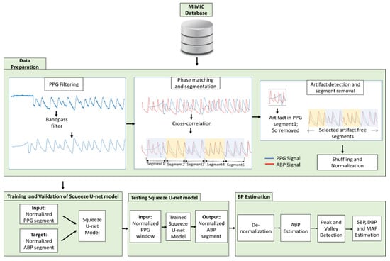 The next step in Figure 1 is data preparation. The Squeeze U-net was used for predicting BP values. As the Squeeze U-net is the SqueezeNet type of the U-net model, the data preparation for training and validation of the model is the same as the process used for the U-net model []. First, the PPG signal acquired from the two databases is filtered by using an Equiripple FIR bandpass filter using a cutoff frequency of 0.5–8 Hz. Frequencies of less than 0.5 Hz and higher than 8 Hz are considered to be noise and are, thus, filtered out.