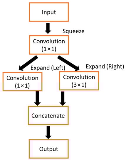 The fire module (Figure 2) comprises a squeeze, two expansion convolution units, and a concatenate unit. The squeeze unit has a 1 × 1 convolution filter. The output of this unit expands the convolution units of 1 × 1 filters (left) and 3 × 1 filters (right) in parallel. The convolution filters in the 1 × 1 squeeze unit, 1 × 1 expansion unit, and 3 × 1 expansion unit are denoted as s1×1, e1×1, and e3×1, respectively. While using fire modules, s1×1 is set less than (e1×1 + e3×1) to limit the number of input samples. In CNN, to decrease the number of parameters, it is necessary to minimize the number of input samples. Thus, the output of the expansion units goes to the concatenate unit to give (e1×1 + e3×1) filters. The result of the concatenate unit is the output of the fire module.