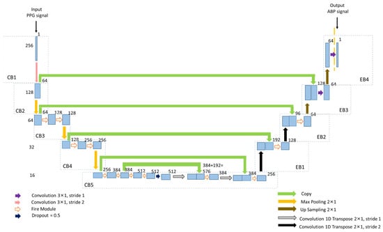 The expansion path has four expansion blocks, which are denoted as EB1, EB2, EB3, and EB4. Each EB1 and EB2 block comprises a 2 × 1 1D convolution transpose unit with stride 2. The output of the convolution transpose unit is passed into the concatenation units. After passing the concatenation units, in EB1 and EB2, the number of feature vectors becomes 192 and 96, respectively. The EB1 and EB2 blocks of the expansion path also have fire modules. The outputs of the concatenation units go to these fire modules. The EB1 fire module of the expansion path has 16 s1×1, 64 e1×1, and e3×1, and EB2 has 16 s1×1, 32 e1×1, and e3×1. After passing the fire modules in EB1 and EB2, the number of feature vectors becomes 128 and 64, respectively. Each EB3 and EB4 block has a 2 × 1 up-sampling unit. The output of the up-sampling unit of EB3 is concatenated with the input layer of CB2. The output of the concatenated unit passes into a 3 × 1 convolution unit of stride 1 in EB3. The EB3 output goes through a 2 × 1 up-sampling unit in EB4. The output of the EB4 up-sampling unit again passes to the 3 × 1 convolution unit in EB4 and gives the output ABP window of 256 samples.