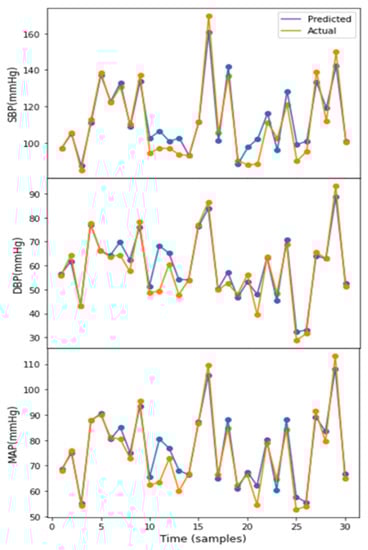 The performance details of the proposed Squeeze U-net model to estimate the real-time SBP, DBP, and MAP values are presented in Table 2. In all three cases, the evaluation factors provide good values, indicating that the network can be used to estimate SBP, DBP, and MAP accurately. The real-time SBP, DBP, and MAP estimation results using the Squeeze U-net model are illustrated in Figure 4. The figure shows the similarity between the predicted and actual values.