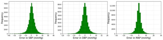 Histograms of error for estimated real-time SBP, DBP, and MAP values.