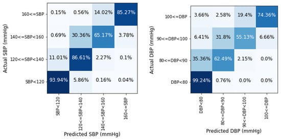 Figure 6 shows that the proposed network performs well in all four BP stages: normal, prehypertension, hypertension stage-1, and hypertension stage-2 []. In the normal stage, the SBP and DBP estimation accuracy rates are 93.94% and 99.24%, with the latter being the highest. The SBP prediction accuracy is better in the prehypertension stage than that of DBP. For hypertension stage-1, the percentage of prediction accuracy is low for both SBP and DBP. For SBP 30.36% and DBP 31.8%, the values are inaccurately predicted as prehypertension stage. Despite minor variations in predicting hypertension stage-1, the prediction accuracy for hypertension stage-2 is fairly good. For a vast amount of data, relatively fewer values are discovered in a deviation area of more than 20 mmHg, which is trivial.