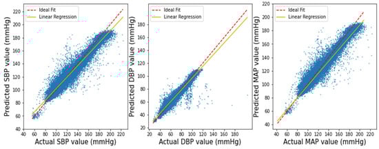 Figure 7 depicts the scatter plots of our anticipated outcome vs. the actual SBP, DBP, and MAP values. It has been demonstrated that the acquired result yields a linear relation, demonstrating that the anticipated outcome is largely correct, except in some situations.