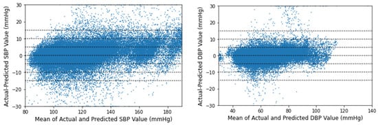 The Bland–Altman analysis for the proposed deep learning model is displayed in Figure 8 according to the AAMI norm []. No Bland–Altman plot exists for MAP in the AAMI norm. The x-axis shows SBP pressures ranging from 80 to 190 mmHg and DBP pressures ranging from 30 to 140 mmHg. The y-axis represents inaccuracies ranging from 30 to +30 mmHg. From 15 to +15 mmHg, reference horizontal dotted lines are provided at 5 mmHg intervals. The mean of each actual BP and its related projected BP is represented by a point across their difference. Differences more than 30 mmHg are shown at 30 mmHg, and differences less than 30 mmHg are plotted at 30 mmHg. Most SBP and DBP discrepancies are between ±5 mmHg in both scenarios.