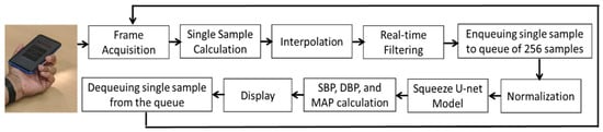 For the implementation phase, the filtering process differs from the training phase. The PPG data are recorded by using the back camera of an android smartphone. A real-time Equiripple FIR bandpass filter is used in the implementation phase to estimate the BP values in real time. The real-time implementation process is shown in Figure 9. Placing the fingertip in the back camera, frames are acquired from the camera. Each time, a signal sample is calculated from the frame by taking the average of the red channel. The sampling frequency of the recorded signal using an android back camera is 30 Hz. The sampling frequency of the recorded signals must match the trained model; thus, linear interpolation [] is performed with the recorded PPG signals []. Real-time Equiripple FIR bandpass filtering is performed on the red channel of the PPG signal by using the same filter coefficients used in the training phase. A single sample of the filtered PPG signal is taken in a 256 fixed-size queue. The segment is then normalized and used as the input of the trained Squeeze U-net model to get the predicted signal of 256 samples. Then the denormalization, peak detection, and estimation of BP values are performed sequentially.