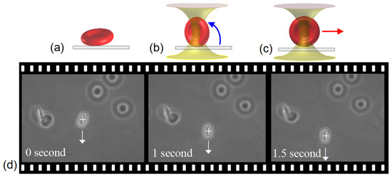 (a–c) schematic illustration and (d) the manipulation films (Video S1, Supplementary Material) of an RBC.