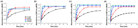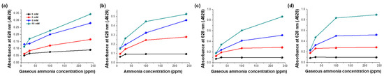 Time profiles of absorbance at 628 nm (A628) of colorimetric film sensors having different concentrations of the bromocresol green (BCG) indicator, specifically (a) 1, (b) 3, (c) 5, and (d) 10 mM, and exposed to the indicated concentrations of ammonia.