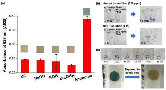 (a) Validation of the selectivity of the colorimetric sensor specific for gaseous ammonia. NC denotes negative control (no exposure to any chemicals). Insets show photographs of the sensors exposed to the indicated chemicals. (b) Optical images showing the changes in the colors of the BCG-PDMS film alone and the full PDMS/BCG-PDMS/PDMS sensor resulting from their immersions into ammonia and NaOH solutions. (c) Optical images showing the reversibility of the colorimetric sensor upon its exposure to the fume of acetic acid.