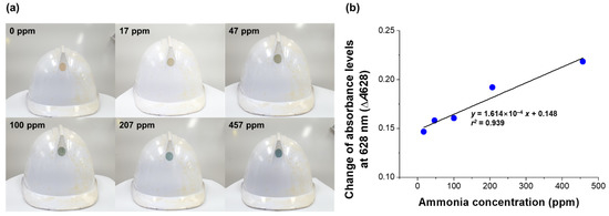 The absorbance change (ΔA628) of the sensor attached to the helmet also increased upon its exposure to increasing concentrations of the released ammonia gas, and did so in a linear fashion following the equation y = 1.614 ×10−4 x + 0.148 and r2 = 0.939 (Figure 7b). The linear regression was different from that of the sensitivity validation (Figure 5c), with this difference attributed to the different operating conditions. The sensitivity test was operated in the batch system; thus, the film sensor was homogeneously exposed to the ammonia gas. Unlike the batch test used for the sensitivity validation, in the test with the sensor attached to the helmet, ammonia gas was introduced into the chamber by releasing it to simulate a leakage of gaseous ammonia in industries. The release of ammonia gas might lead to the heterogeneous distribution of ammonia gas in the chamber system. The different exposures probably resulted in the different linearities of absorbance change versus concentration of ammonia gas (Figure 5c and Figure 7b).
