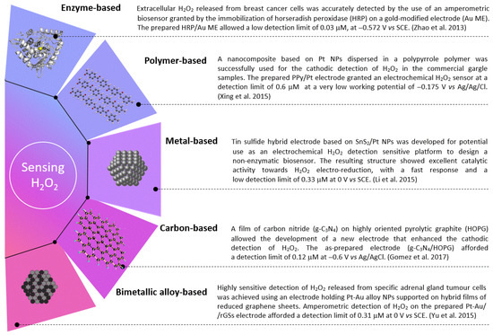 Whenever possible, adjustments to the electrode are desirable by incorporating several materials to increase the catalytic effects resulting from such materials’ synergy. Some materials have shown distinct advantages over conventional materials for H2O2 detection when combined, adapted, or rearranged. Several H2O2 sensing’ electrodes are illustrated in the graphical diagram from Figure 1.