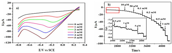 (a) Linear Sweep Voltammetry of the PtNi/NCNFs (3:1)-GCE electrode at different H2O2 concentrations. (a) Current-time response of PtNi/NCNFs (3:1)-GCE to the successive additions of H2O2 at −0.1 V. (b) Amperometric response curve at PtNi/NCNFs (3:1)-GCE to successive additions of 0.1 mM H2O2 and other electroactive species at −0.1 V (c) in 0.2 M N2-saturated PBS. Adapted from Guan et al. [90], Copyright 2018 Elsevier.