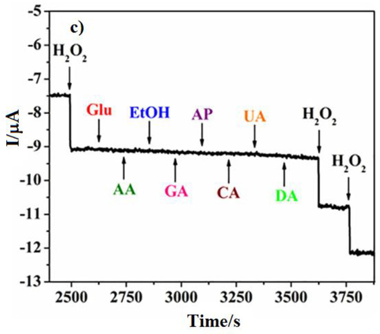 By 2018, Guan et al. [90] prepared a PtNi(3:1) alloy on N-doped carbon nano-fibres by electrospinning that exhibited an excellent sensitivity of 248.5 μA mM−1 cm−2 towards the reduction of H2O2 in an electrolyte of pH 7.24 standardised by PBS, reaching a relatively low limit of detection of 0.0375 μM. The studied nanocomposite alloy presented a high catalytic performance at a relatively low potential of −0.5 V vs. SCE, with the reduction current reaching −350 µA. The decay of the transient current, observed under a chronoamperometric analysis of the 1.0 mM H2O2 reduction reaction on PtNi/NCNFs/GCE, pointed to a diffusion-controlled process. This process allowed Cottrell’s expression to apply to obtain the catalytic rate constant for H2O2 reduction as 3.13 × 104 mol−1 s−1. The resulting prepared electrode exhibited a progressive reduction current response with increasing the concentration of H2O2 (Figure 2a) in a rapid, sensitive (Figure 2b) and selective (Figure 2c) way.