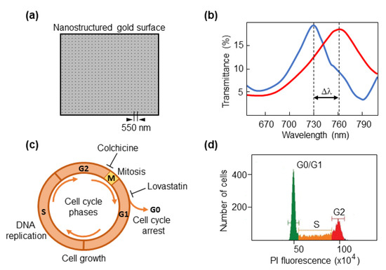 We used our previous optical setup with the plasmonic nanohole biosensor (Figure 1a) to detect spectral shifts in cells (Figure 1b). No significant changes in transmission were detected in the measurements performed in this work. To test the capacity of the biosensor to discriminate between different phases of the cell cycle, cancer cells were synchronized either in G0/G1, which precedes DNA synthesis, or the G2 that goes after DNA has been duplicated and precedes mitotic division (Figure 1c). Colorectal cancer cells were cultured with lovastatin, which mediates inhibition of DNA replication and arrests cells in early G1 phase by disrupting the proteasome pathway [36,37]. Thus, most cells would be either in the G0 (quiescent/resting state) or G1 phase. As we used a fluorescent DNA dye to measure DNA content in a flow cytometer, resting G0 cells and cells in G1, an interphase state that represents the first step of cell growth, appear in a single peak (DNA content 2N, diploid) followed by a flat S phase in the FACS profile where the DNA is being duplicated (Figure 1d).