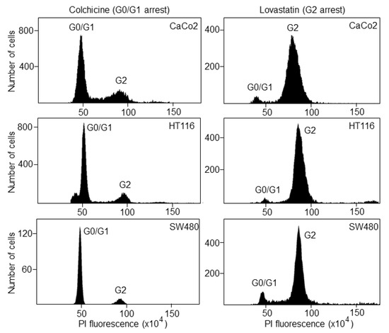 Once the S phase has finished, the DNA content is 4N (tetraploid), which corresponds to the G2 phase. Following treatment with lovastatin or colchicine, about 80% of all cancer cell lines were arrested in the G0/G1 or G2 phase, respectively, as determined by FACS analyses (Figure 2).