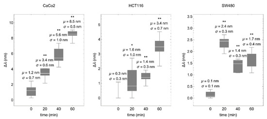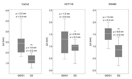 The biosensor discriminates between cell-cycle phases. Spectral shift (Δλ) comparing colorectal cancer cells synchronized in G0/G1 with the same cells synchronized in G2. The synchronization procedure was the same as described above. μ represents the mean and σ the standard deviation. * p < 0.05, ** p < 0.001.