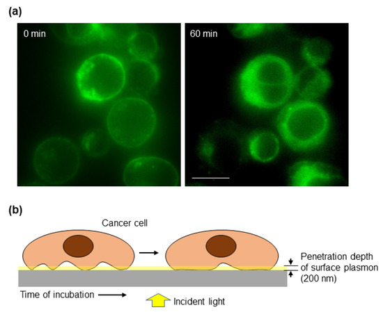 Another key feature of cancer cells is their ability to modify their cell–cell and cell–ECM interactions to promote invasion of the surrounding tissue and eventually to establish a distant metastasis [2]. Typically, the actin cortex is thicker in rounded cells than in spread cells. Using high-resolution imaging, it has been shown that cortex thickness is reduced at high spread areas, which is also found during monocytic differentiation that takes place concurrent to cell spreading [44]. Based on this and taking into account the key contribution of the actin cortex to the spectral changes detected by the biosensor, we studied whether our optical system could monitor the process of cell attachment to a substrate. To have a more physiologically relevant model, the biosensor was coated with fibronectin, a ubiquitous ECM protein. Cells deposited onto the substrate increase their contacts (focal adhesions) with the ECM generating tension forces that will allow cell spreading. These contacts may be transmitted from the periphery, where they allow the cell to be more sensitive to changes in the microenvironment [45], to the center of the cell, as it can be deduced from the TIRF images (Figure 4a) and as it has also been previously modeled [46]. Cancer cells were stained with a fluorescent membrane marker and deposited on a fibronectin-coated slide for TIRF microscopy, which has been widely used for studying cell adhesion and the dynamics of the outer layers of the cell [47]. The penetration depth of TIRF microscopy depends on the angle of illumination resulting in a range of depths that typically vary from 70 to 200 nm [47]. Then, TIRF microscopy allowed us to focus on the first 200 nm above the surface, which is the penetration depth of the surface plasmon detected by the biosensor. As shown in Figure 4a, 60 min after cells were deposited onto the slide, there were more cell cortexes within the plasmonic area as determined by an increase in the fluorescent signal. Thus, we envision a model where the size of the cell cortex under the plasmon influence increases over time (Figure 4b).