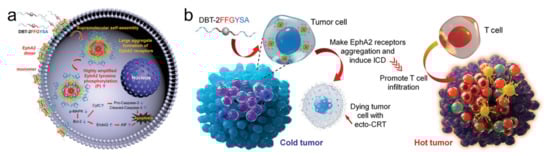 (a) Schematic diagram of DBT-2FFGYSA inducing EphA2 receptors form large aggregates beyond dimers. (b) Schematic diagram of the proposed mechanism for converting immunologically cold to hot tumors by DBT-2FFGYSA. Adapted with permission from [47]. Copyright 2021 John Wiley and Sons.